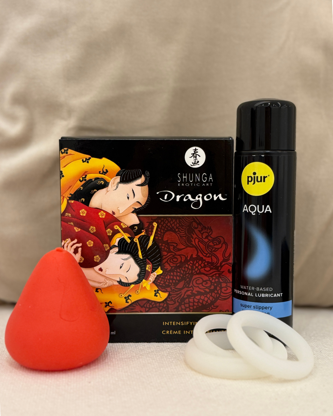 As texturas do ovo masturbador despertam cada movimento, os anéis penianos prolongam e intensificam a sensação, o lubrificante suaviza o toque e o creme potenciador aquece o momento com um impulso extra de energia. Seja a solo ou em boa companhia, este é um ritual completo para mergulhar num prazer mais profundo e consciente.